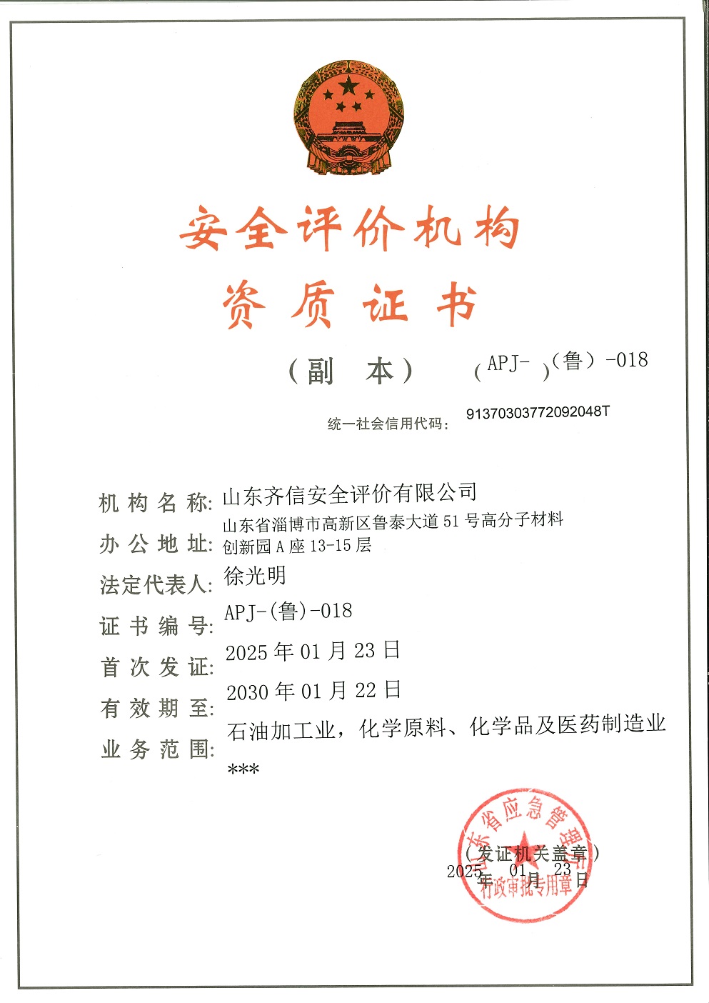 山東齊信安全評價有限公司成立于2005年3月,注冊資本300萬元人民幣,固定資產(chǎn)總值804.8728萬元。法定代表人徐光明,注冊地址及辦公地址位于淄博高新區(qū)魯泰大道51號高分子材料創(chuàng)新園A座13-15樓。2005年9月取得安全評價機(jī)構(gòu)乙級資質(zhì)。自國家應(yīng)急部1號令實(shí)施以來,公司于2020年1月15日取得新安全評價資質(zhì),業(yè)務(wù)范圍包括:陸上油氣管道運(yùn)輸業(yè);石油加工業(yè),化學(xué)原料、化學(xué)品及醫(yī)藥制造業(yè);金屬冶煉。2018年12月21日取得安全生產(chǎn)標(biāo)準(zhǔn)化二級評審單位,評審范圍:危險化學(xué)品、紡織、建材、輕工、冶金、機(jī)械。 公司現(xiàn)有人員41人,其中專職安全評價師37人,注冊安全工程師26人,研究員1人、碩士5人、雙學(xué)士1人,山東省安全專家?guī)鞂<?人、教授級高工1人,高級工程師8人、工程師22人,專職危險化學(xué)品標(biāo)準(zhǔn)化評審員、工商貿(mào)標(biāo)準(zhǔn)化評審員30人,本科以上學(xué)